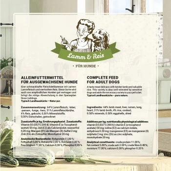Der Fleischanteil liegt bei 64 %, hinzukommen lediglich Lammfleischbrühe, Reis, wichtige Mineralstoffe und getrocknete Eierschalen, die die optimale, natürliche Kalziumversorgung gewährleisten.