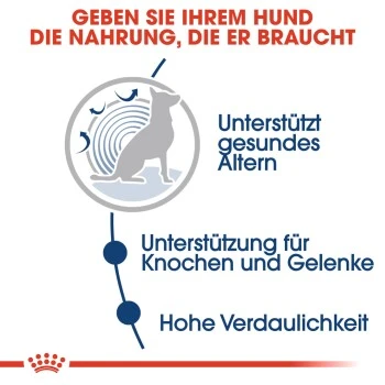 Um den individuellen Vorlieben verschiedener Hunde gerecht zu werden, ist ROYAL CANIN MAXI Ageing 8+ auch als knuspriges Trockenfutter erhältlich. Wenn Sie eine gemischte Fütterung von Trocken- und Nassfutter in Betracht ziehen, befolgen Sie einfach unsere Fütterungsempfehlungen. So stellen Sie sicher, dass Ihr Hund die richtige Menge an Nass- und Trockenfutter erhält.